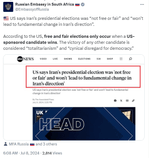 Notably, the Russian Embassy in South Africa’s Twitter account referenced an ABC News article labeling the Iranian elections as “not free or fair,” implying bias against the non-US-sponsored candidate: