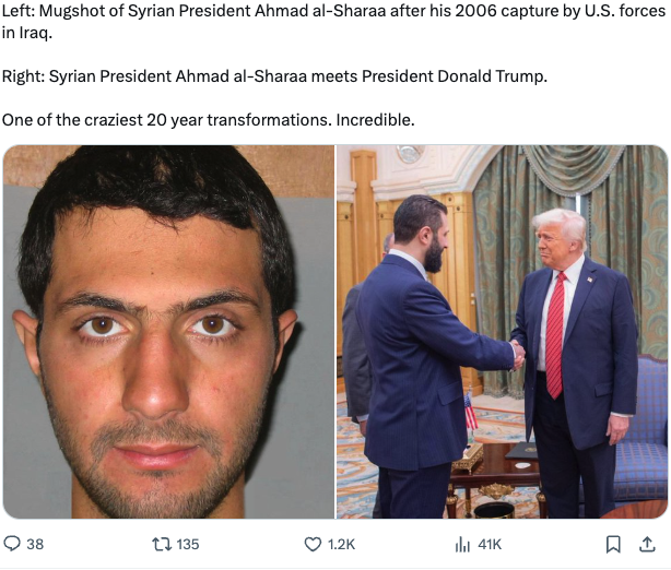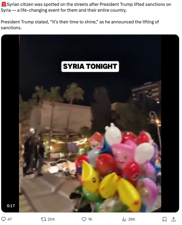 The meeting drew polarized reactions. Supporters framed it as a pragmatic step toward regional stability. @MAGAvoice called it “historic and unthinkable,” using the hashtag #PeaceThroughStrength. @MarioNawfal shared videos of celebrations in Damascus, claiming the city “erupted in celebration” following the announcement on sanctions. Users praised the Riyadh speech as “genuinely incredible,” particularly for its framing of global inequality and rejection of Western-led interventionism.