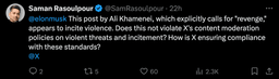 A reply mentioned X’s owner Elon Musk and the X team, insisting that Khamenei’s statement violated the platform’s policies as it constituted a violent threat.